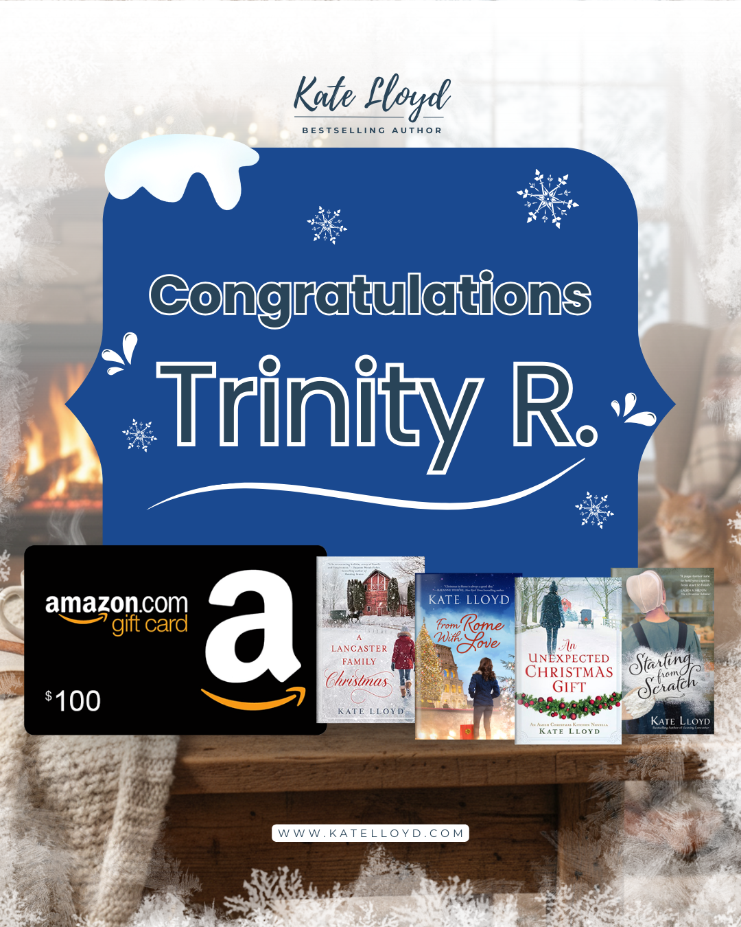 Please help me congratulate Trinity R, the winner of my giveaway of a $100 Amazon gift card and a Kate Lloyd title. Many thanks to all who entered. I appreciate each and every one of you!