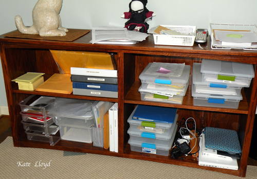 Our house doesn’t lack for bookshelves. The problem? They’re all full! Our son’s old bedroom, my writing room, now houses a new bookshelf where I decided to organize papers, padded envelopes for sending out prizes, photography necessities, and much more. If I could just figure out a system.